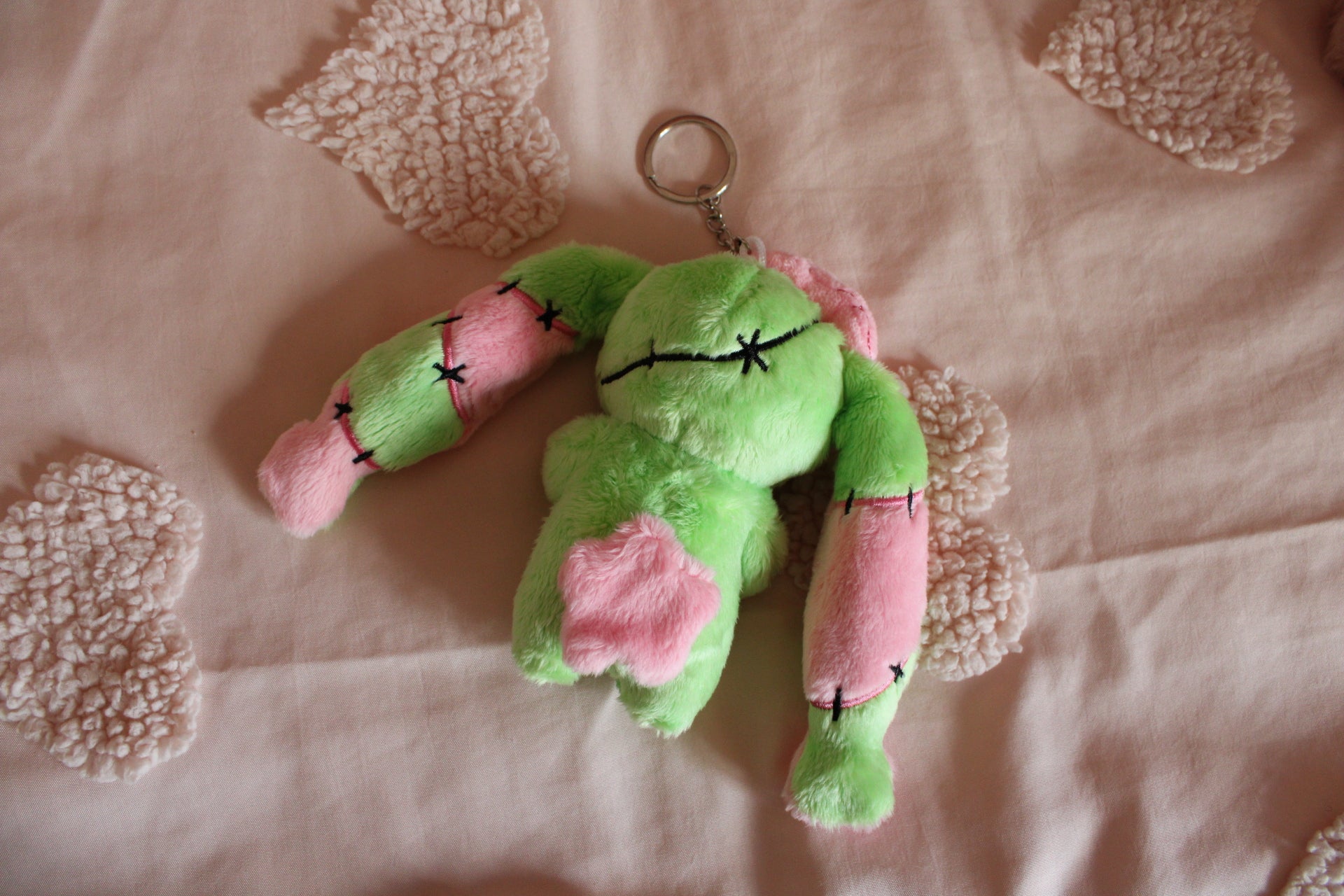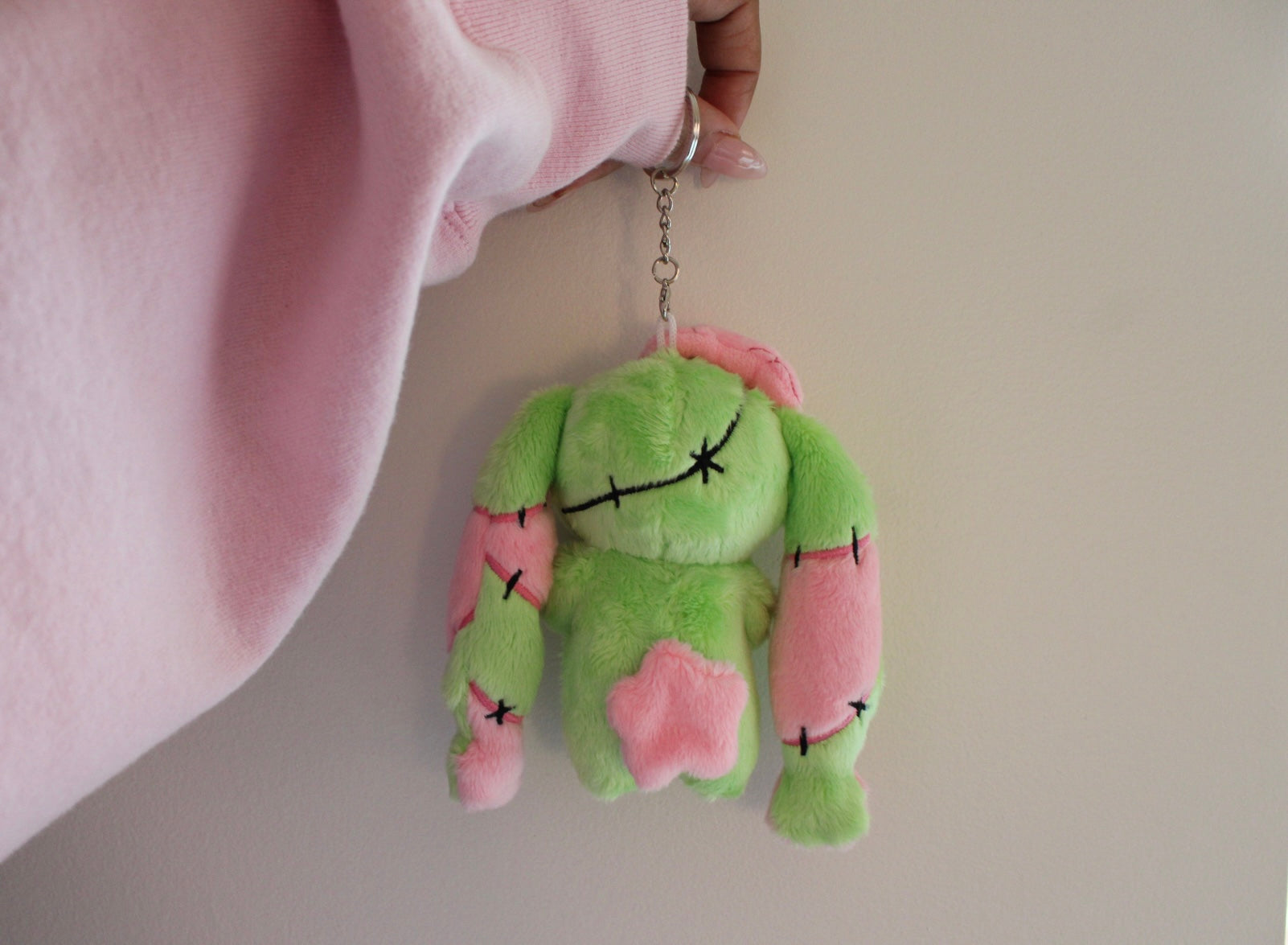 Meet Zombie Kit, the cute-but-creepy addition to your Halloween collection! This 5-inch keychain plush features a fun, ghoulish green color with spooky stitched details and a pink star on its head. Small enough to carry with you wherever you go, this keychain is perfect for adding a little spooky flair to your bag or keys🧟