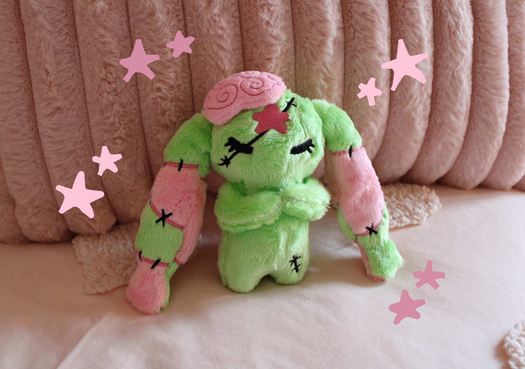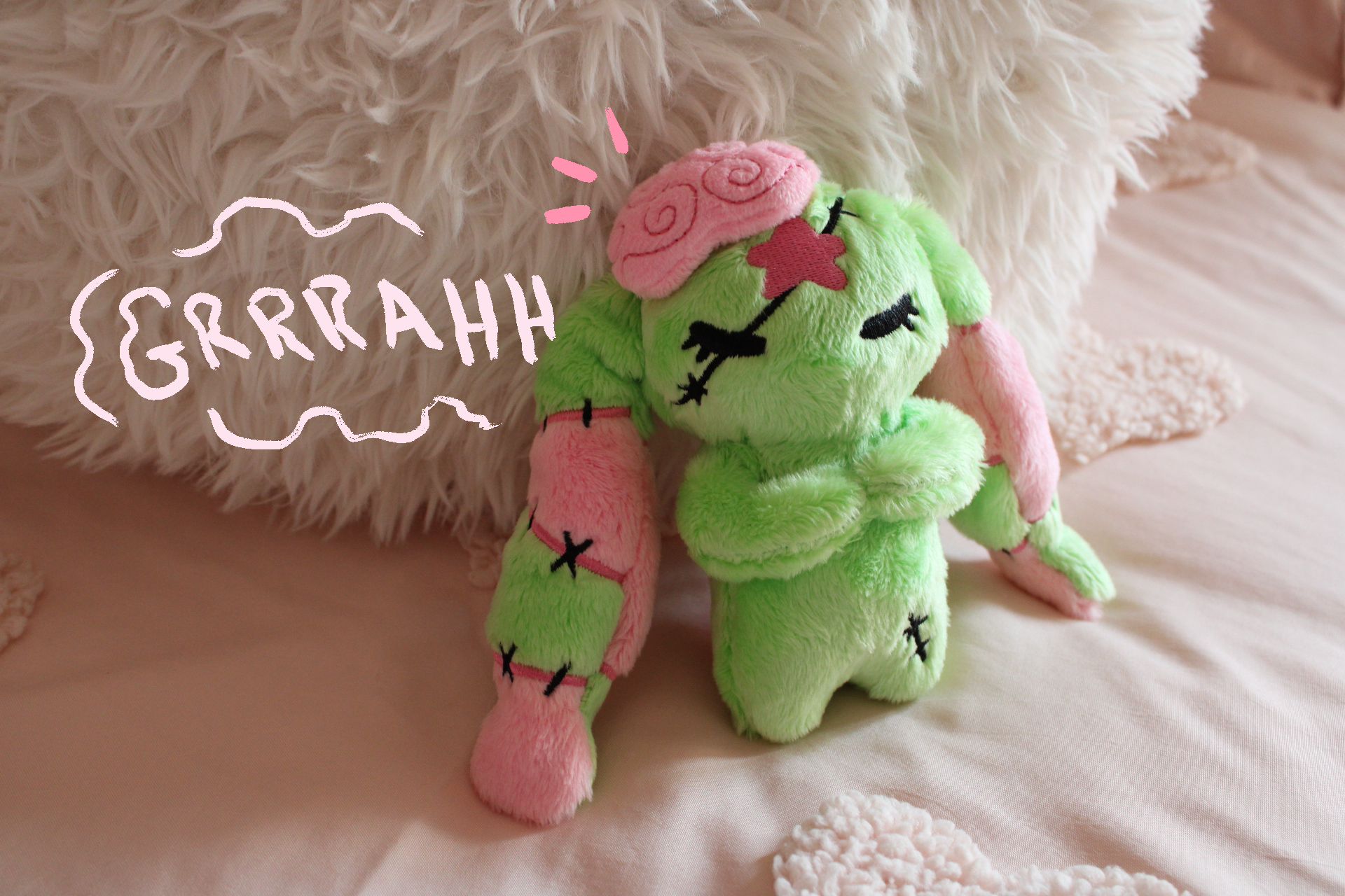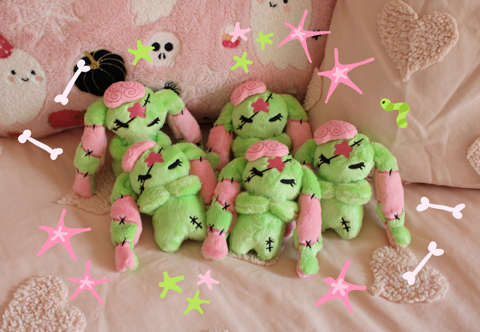 this is zombie bun-bun 💕🧟♀️🧠 she’s a super soft keychain with detailed stitching and plush textures a mix of spooky and sweet ♡each one comes with an extra heart keychain and a circular keychain as a little bonus to accessorize your bags or keys ✩perfect for halloween season or all year around!